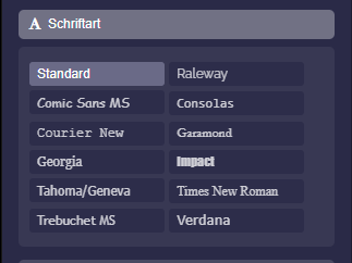 Schriftart Sie können eine der 12 bereitstehenden Schriftarten auswählen. Auswahl der Schriftart Hinweise: FAQ: Wie kann ich die Schriftgröße einer Map ändern?FAQ: Warum können keine weiteren Schriftarten eingebunden werden?FAQ: Wieso wird die gesetzte Schriftart korrekt am PC/MAC, aber nicht auf einigen Smartphones und Tablets angezeigt? ⚙ schriftart